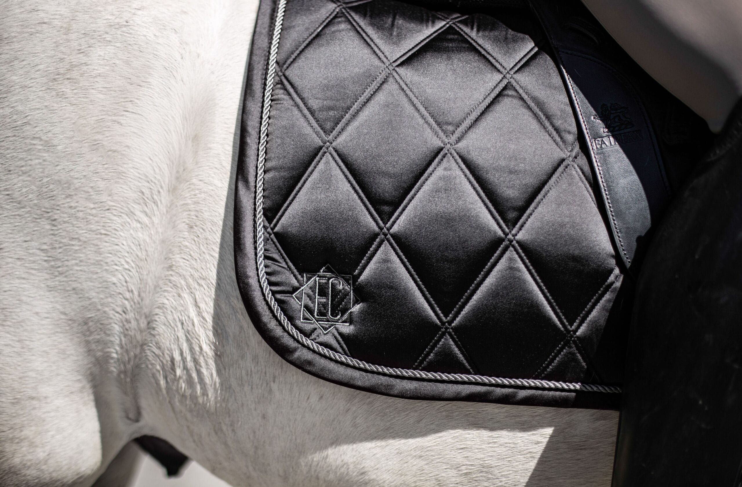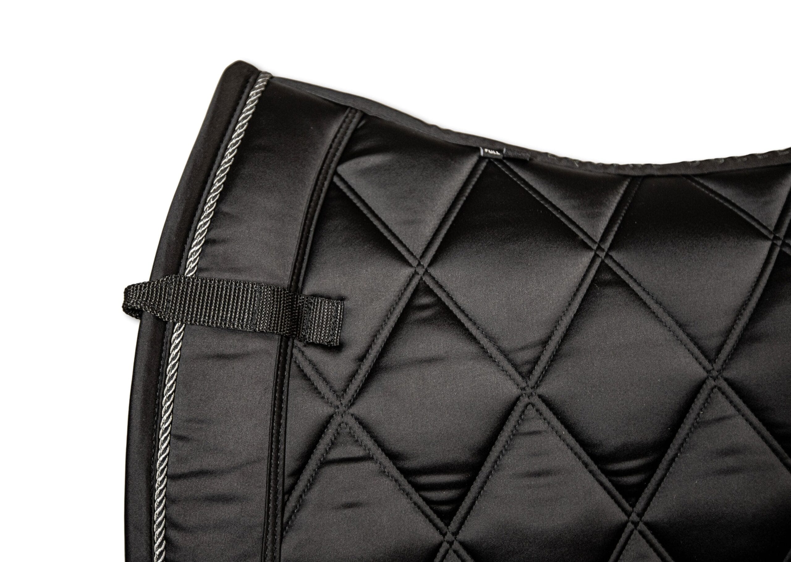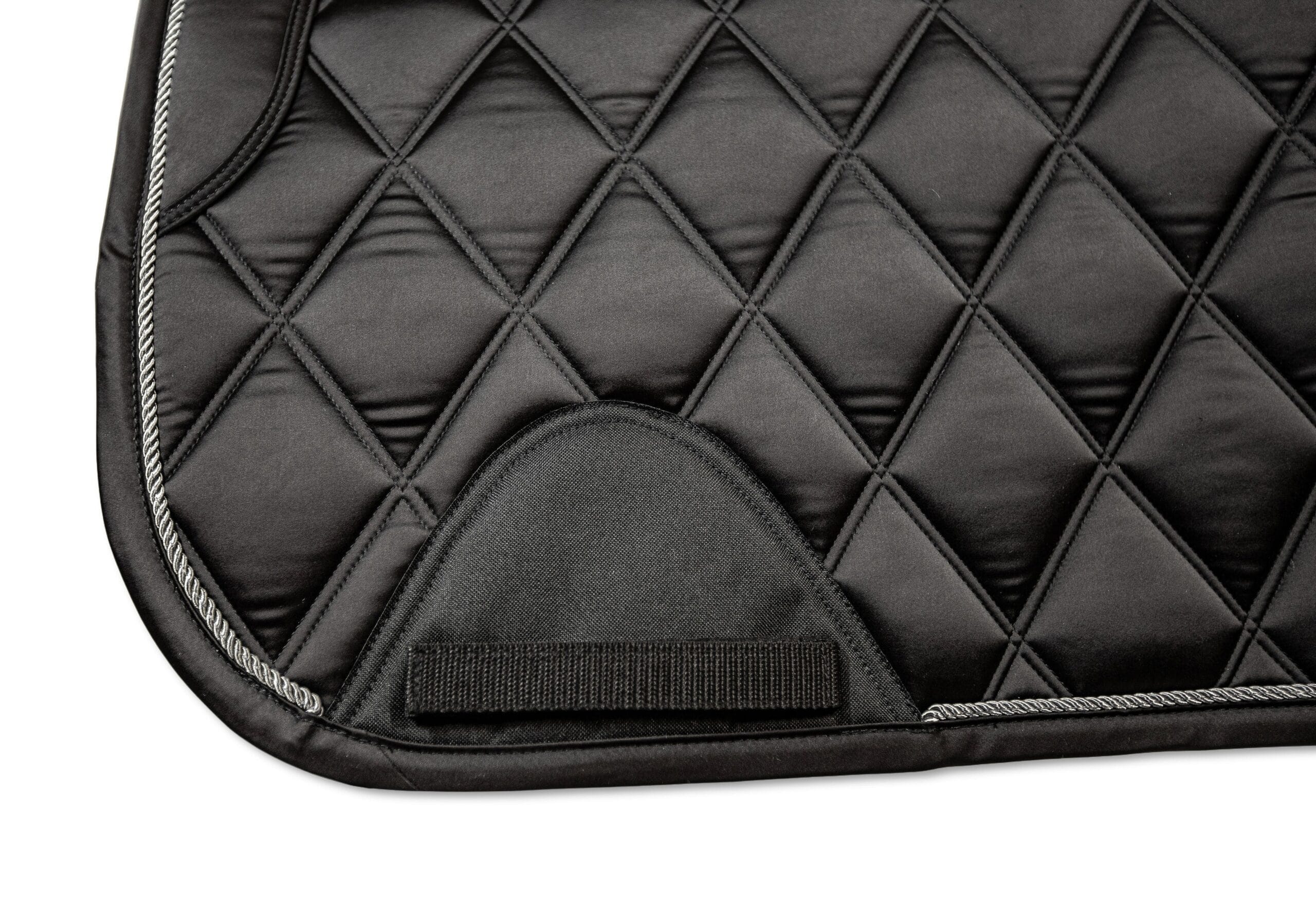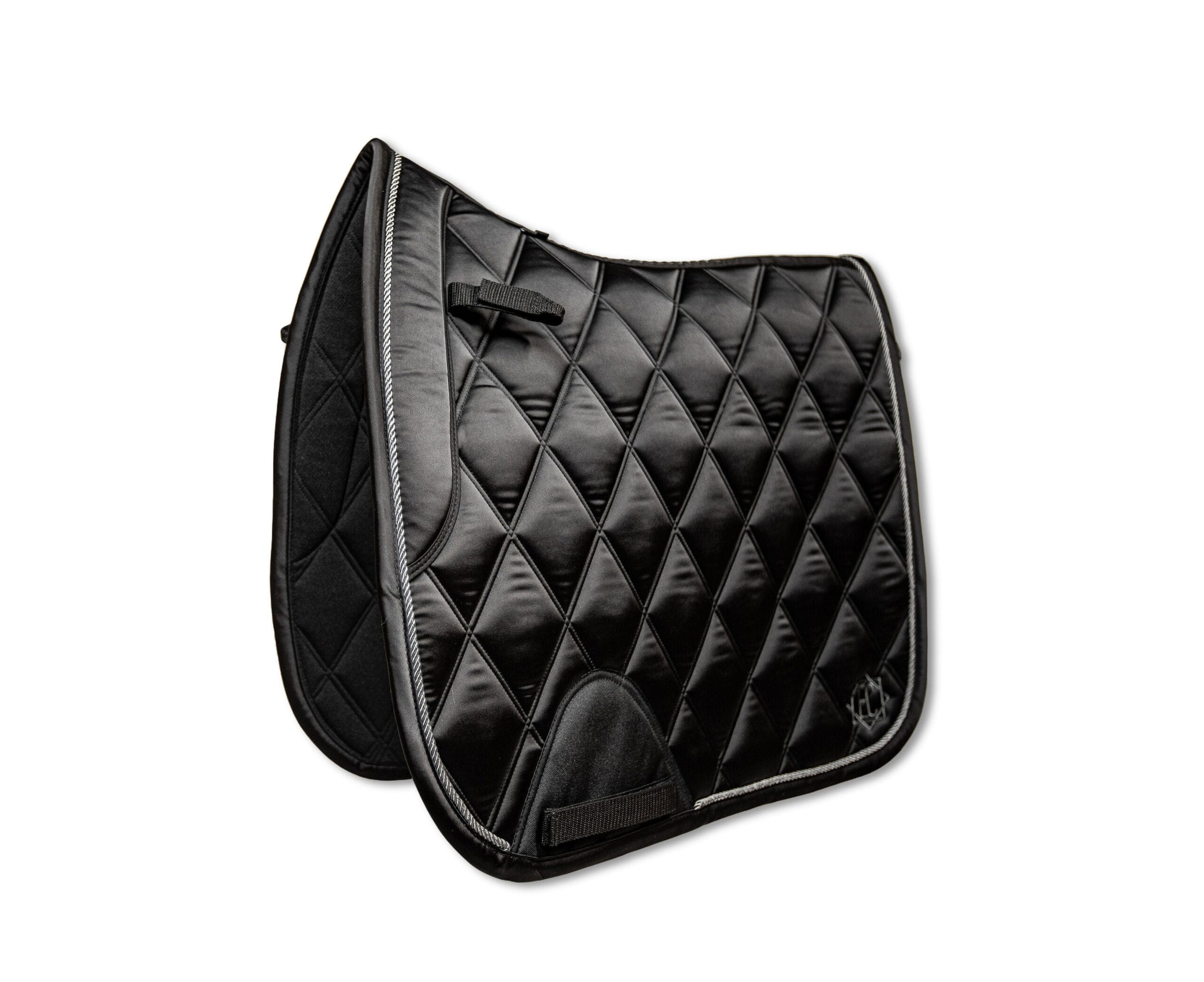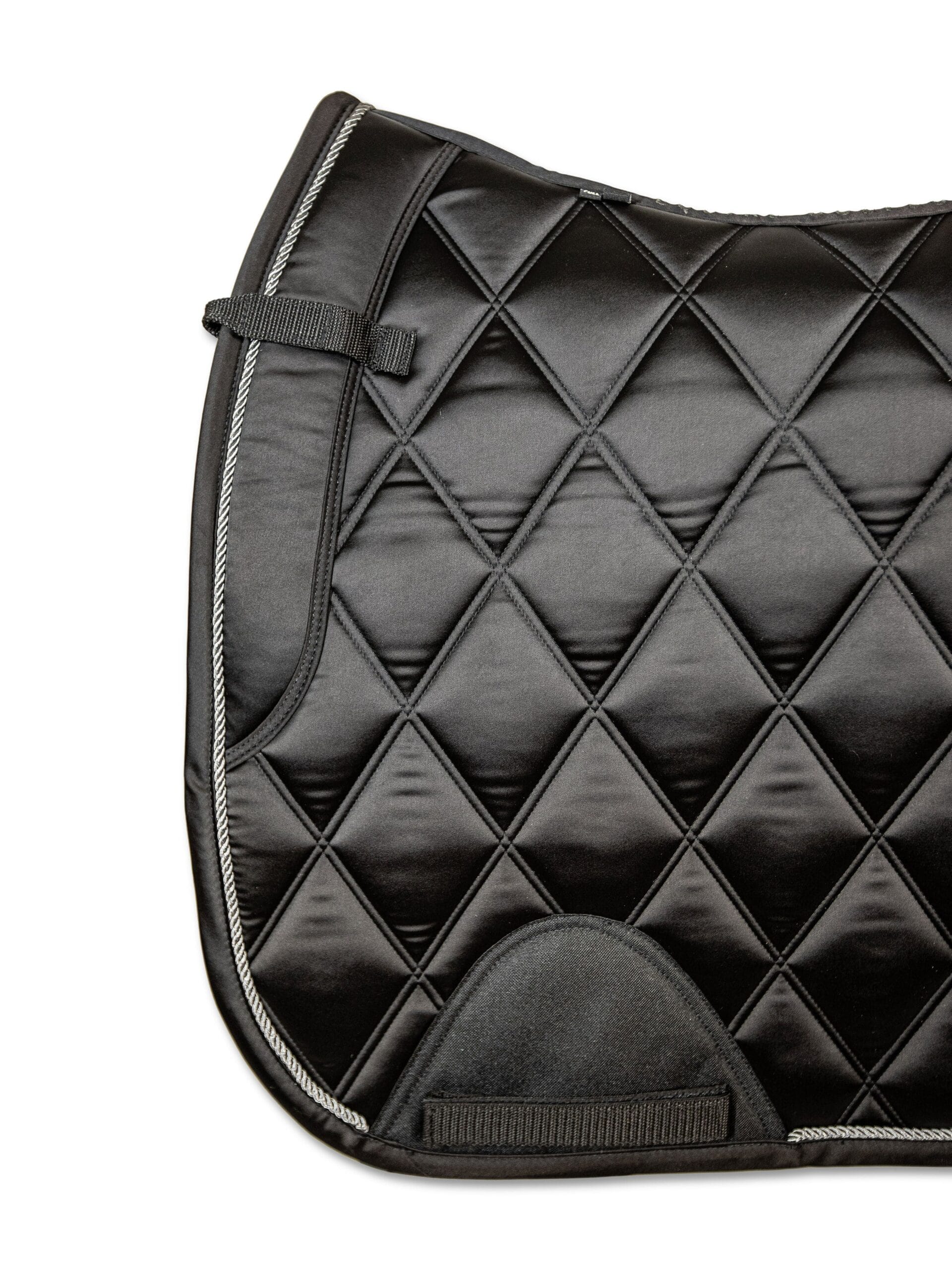 Luxurious feeling pads are made with the horse’s comfort in mind Smooth satin fabric outer layer Breathable and moisture wicking black mesh material lining Anatomically designed shape with wither clearance Wither cushion and D-ring straps to keep pad securely in place and reduce friction Girth area has added protective material to prevent wear and no cord piping to reduce pressure point for the horse Designed in Canada Bundle with other items of the same color for a classy head-to-toe look.