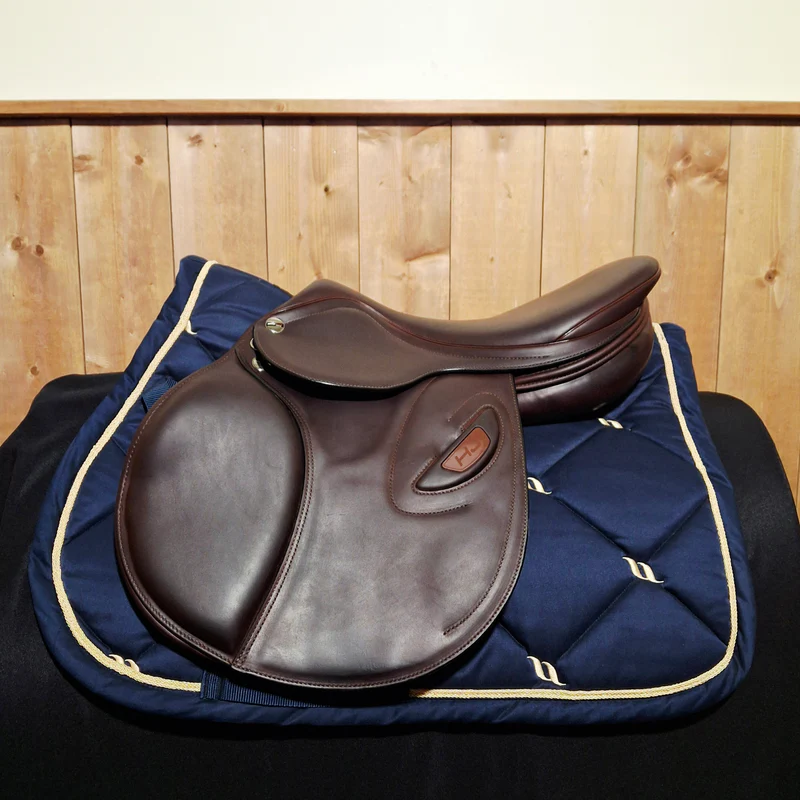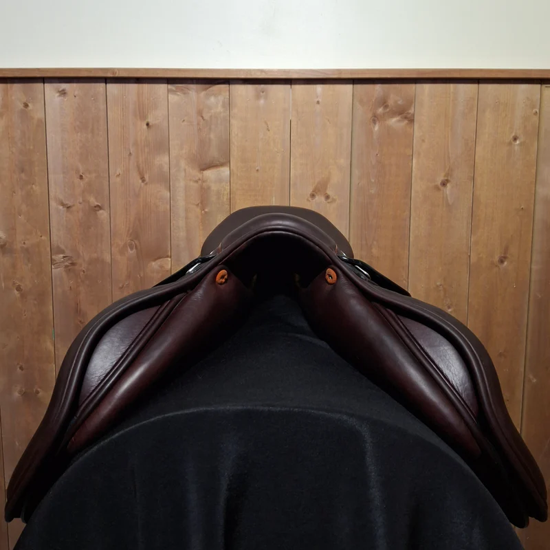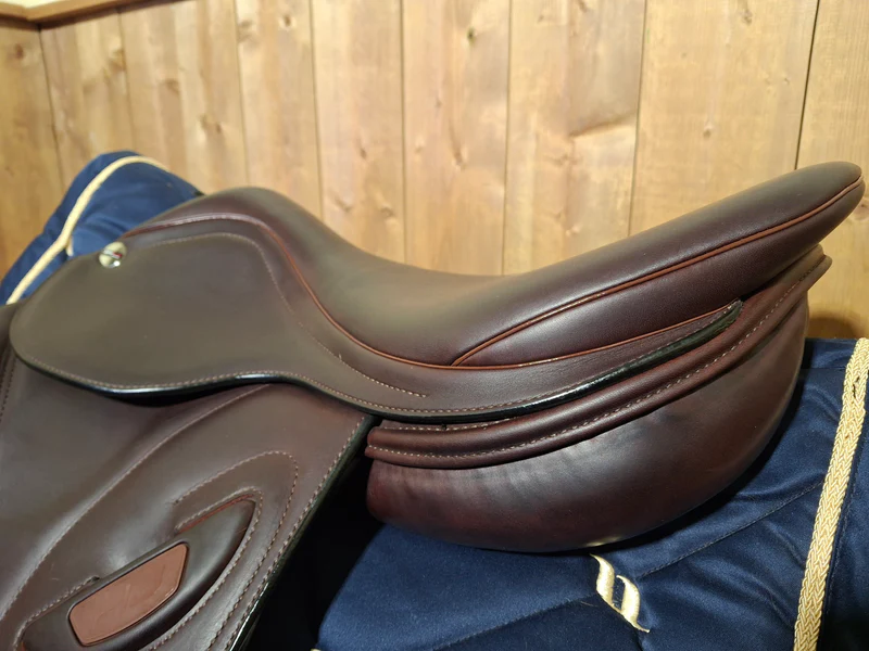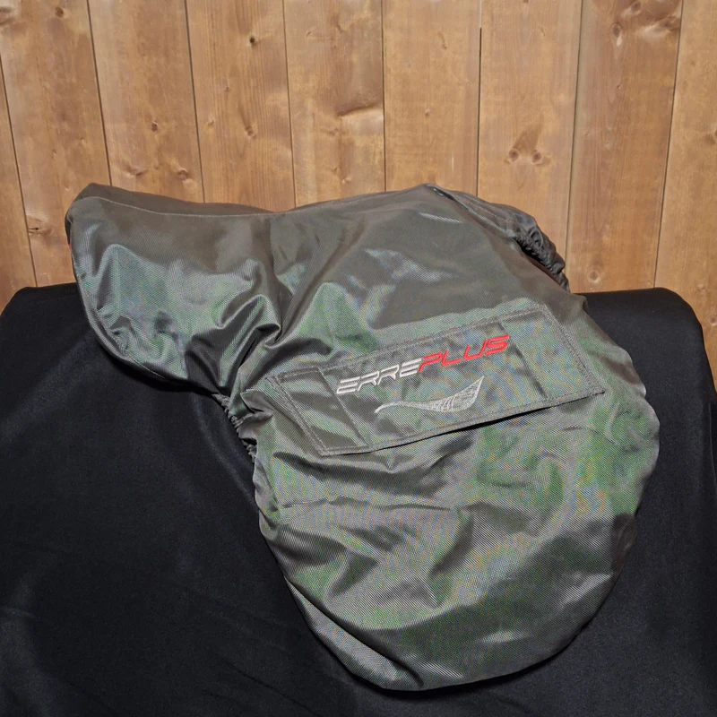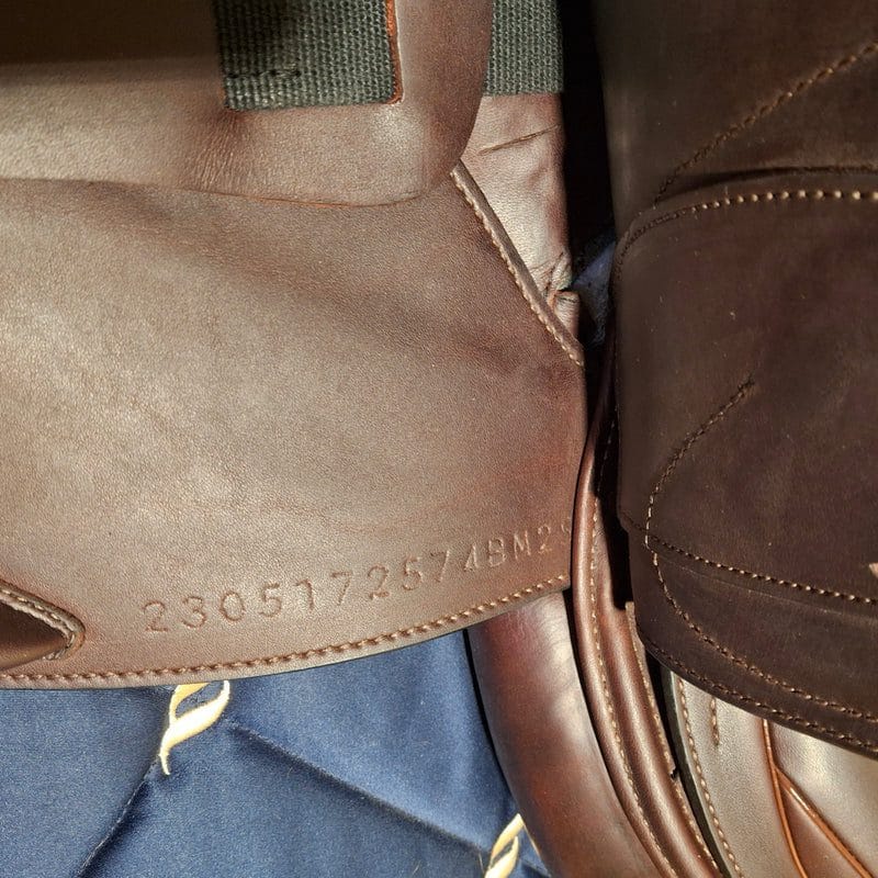 Adjustable tree currently set to 34 cm Wool flocked Flat seat Narrow twist 17″ seat and 25 cm seat width Standard 13″ flap angle and length Molded thigh block and covered calf block Rich cocoa Bull leather for softness, grip and durability Serial # 2305172574BM250 Erreplus Saddle Cover