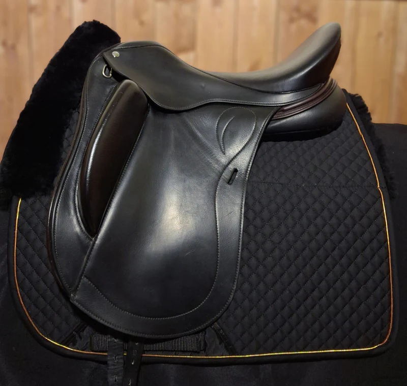 Newer black Regal monoflap dressage saddle, with brown front and rear facings, in great condition! Semi-deep 17″ seat and shorter 15″ flaps. Wool flocked panels, external knee blocks. Cutback shoulder relief panels. Nice open head plate and wide gullet channel for great spinal clearance. Tree is adjustable, set to approx medium wide width. Super nice saddle! Regal saddles are lovely saddles made in Canada by saddle maker Kevin Lote.